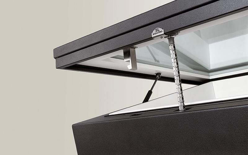 Realizzazione su misura di lucernario blindato con vista interna panoramica tutto vetro senza telaio a vista, struttura eseguita con tubolari e lamiere in acciaio inox colore RAL. Lato interno rifinito con imbotte in legno spessore mm 20 verniciato colore RAL smontabile tramite magneti. Vetro blindato P6B con camera isolante più vetro esterno 8 mm temperato. Tripla guarnizione di tenuta, automazione invisibile singola o doppia secondo dimensione, e molle a gas per garantire una morbida movimentazione.